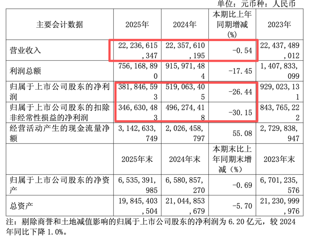 老百姓的年报数据显示,公司2025年实现营业收入222.37亿元,同比下滑0.54%;归母净利润3.82亿元,同比下滑26.44%;扣非归母净利润3.47亿元,同比下滑30.15%。