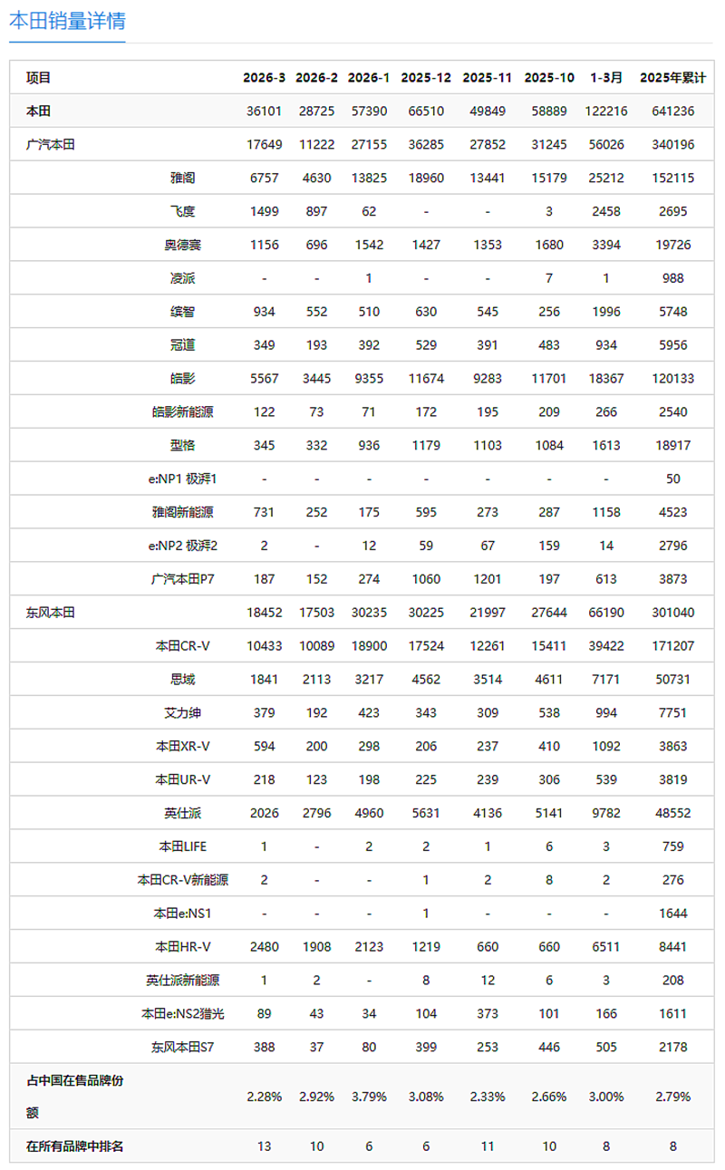 本田汽车在华市场销量最高纪录(年销量)达到162.7万辆,时间为2020年,可是之后却连续下滑!2025年全年销量为64.53万辆,2026年第一季度销量为12.2万辆。其三月份零售销量显示为36101辆,其中广汽本田销量为17649辆,东风本田为18452辆,可以说是大不如前;在巅峰期的阶段里,诸如本田CR-V、皓影、雅阁或者思域等畅销车型,其单车销量即可达到两万辆左右,相当于三月份的品牌销量。